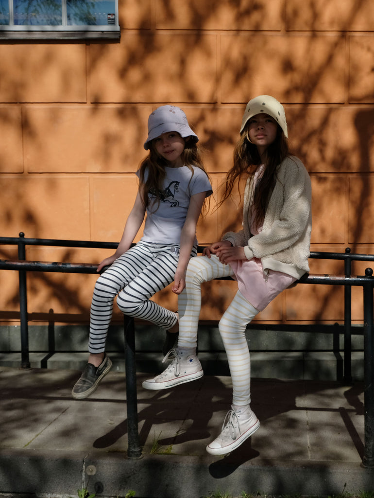 Soft and comfortable leggings in organic cotton jersey. Adjustable at waist for a better fit and perfect for sizing up for longer wear. Coral pink and white stripes with the cutest little cherry at front. Printed logo and sizing information.