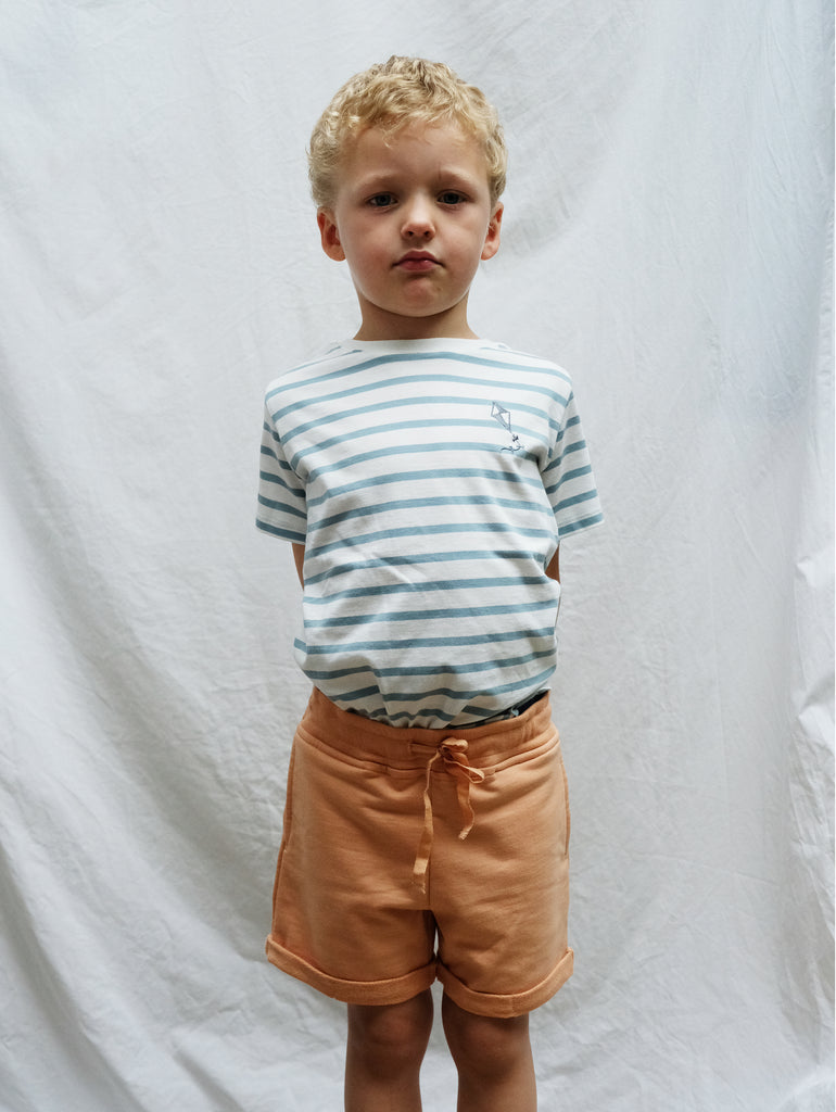 Unisex shorts in organic cotton with ribbed waist and a herringbone drawstring. A little fold-up completes the look. These shorts will be your kids favourite in the summer months and can then be passed on to siblings or friends.