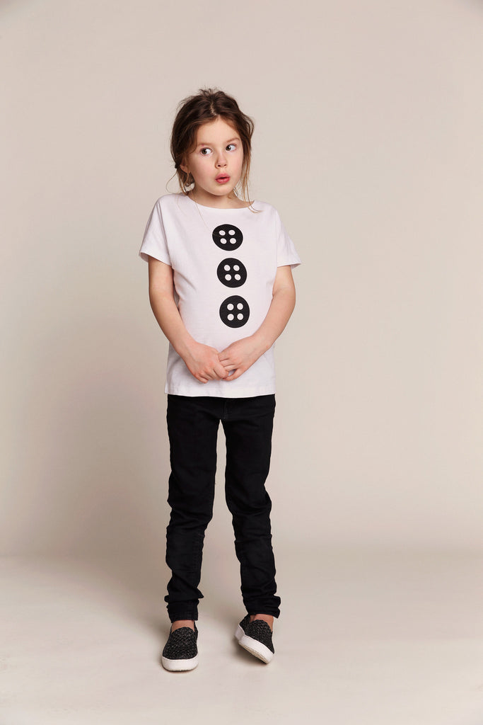 POP TEE is our classic cut t-shirt, simple but perfect. Button print at front.