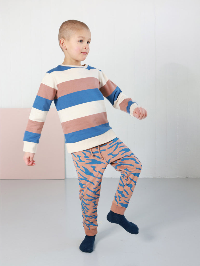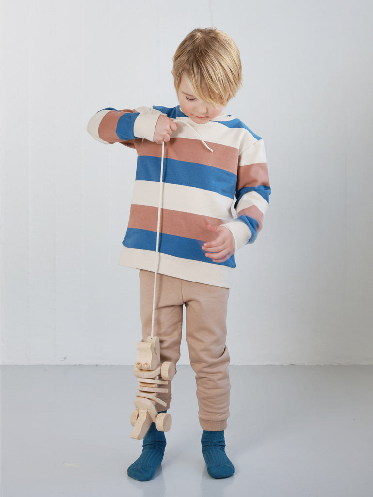 This striped sweatshirt will be a brilliant addition to your kids wardrobe and is a perfect for everyday use. So soft inside it will be an instant favourite. Classic cut with round neck, cuffed long arm sleeves and cuffs at waist. Size 1yr has buttons at shoulders.