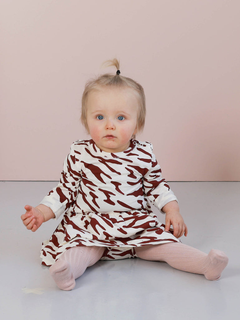This combination between a body and a dress is so sweet and takes all the benefits of a body with the cuteness of a dress. No more dress hitching up to the ears or twisting around, instead the body part will make sure it stay where it should be. Off white fabric in the softest organic cotton with pale red tiger fur.