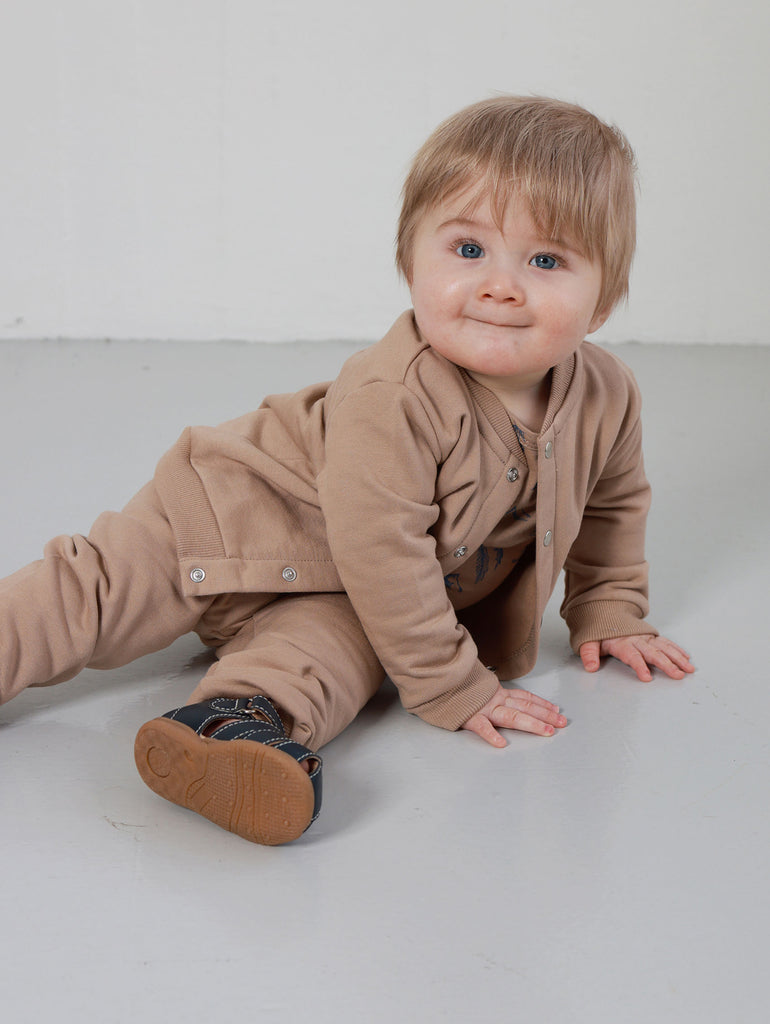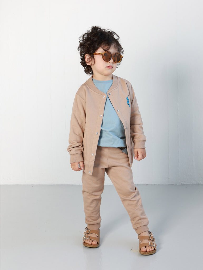 Jacket with snap button at front and small tiger embroidery at front. Two pockets at side waiting to be filled with treasures. Brushed soft inside for a really comfy feel. Perfect as an alternative to a sweatshirt or a summer jacket.
